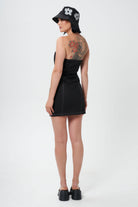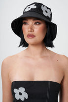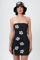 Our Y2K strapless mini denim dress features our custom embroidered reflective flowers. We of course had to make a matching bucket hat with the same embroidered reflective flowers to pair it with, it’s the perfect summer or festival set!
